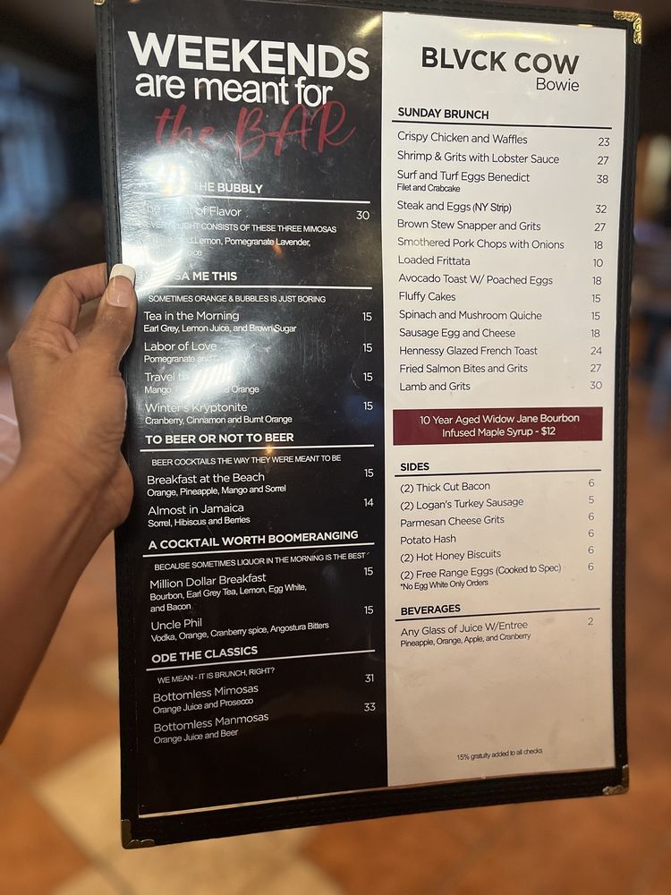 “ I visited Blvck Cow this past Sunday, 8/4, for a friend's bday brunch. I'd never heard of the establishment before, and wasn't expecting it to be in a regular ol' plaza, but it was. The restaurant itself occupies a large space with one side devoted to tables and chairs and the other side a bar that spanned the wall, plus a lot of high top tables and chairs. Decent decor, though nondescript. Very clean bathrooms. First, there were A LOT of us. A LOT. Our server was a champ - I didn't get her name, but she's a small-framed petite woman with short blond hair. Anyway, excellent service from her. She kept her cool through multiple rounds of orders (drinks, apps, entrees) and all the questions from 14 women (and it likely got worse for her once we started drinking). I went with the bottomless mimosa, GM crunchy french toast, a side of eggs fried hard, and bacon (and possibly the potato hash, can't remember because of mimosas). I wanted the housemade corned beef hash, but they were out. Totally disappointed, I'm a corned beef hash connoisseur. Also, didn't love how all the entrees are a la carte. I feel the french toast should have at least come with eggs. All of the food was really good, but I'd say the french toast was pretty rich and I was unable to eat it all. I was nice and full and buzzed though, so no complaints. Again, our server was super helpful through the payment process. Blvck Cow doesn't split checks, but does take separate payments for large groups, so keep that in mind. Overall, excellent visit. I don't live out that way, so doubtful I become a regular, but good to know of decent spots to eat in various area codes! ”